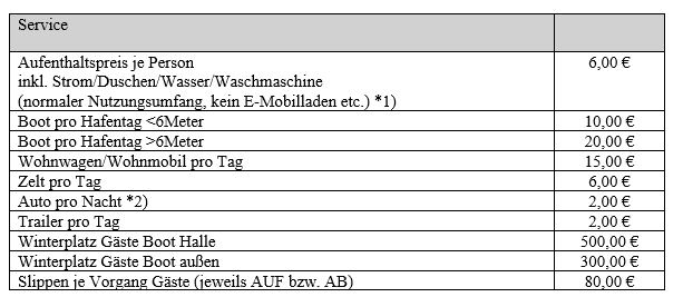 *1) Hafentag = 11.00 Uhr bis 11.00 Uhr des Folgetages. inkl. Strom/Duschen/Waschmaschine (normaler Nutzungsumfang, kein E-Mobilladen etc.)